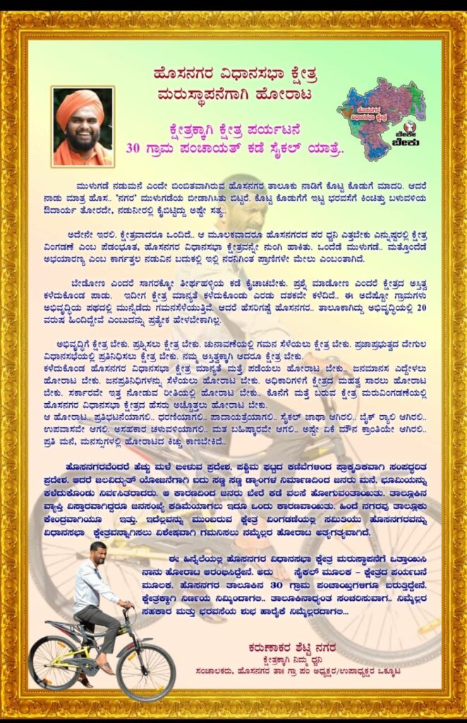 ತಾಲ್ಲೂಕಿನ 30 ಗ್ರಾಮ ಪಂಚಾಯಿತಿಗಳಿಗೆ ಸೈಕಲ್ ಮೂಲಕ ಭೇಟಿ ನೀಡಿ ಅಲ್ಲಿನ ಜನರಲ್ಲಿ ಕ್ಷೇತ್ರ ಮರು ಸ್ಥಾಪನೆ ಹೋರಾಟದ ಕಿಚ್ಚನ್ನು ಬಿತ್ತುವ ಕೆಲಸ ಕೈಗೊಂಡಿರುವುದಾಗಿ ಸುದ್ದಿಗೋಷ್ಟಿಯಲ್ಲಿ ತಿಳಿಸಿದರು.