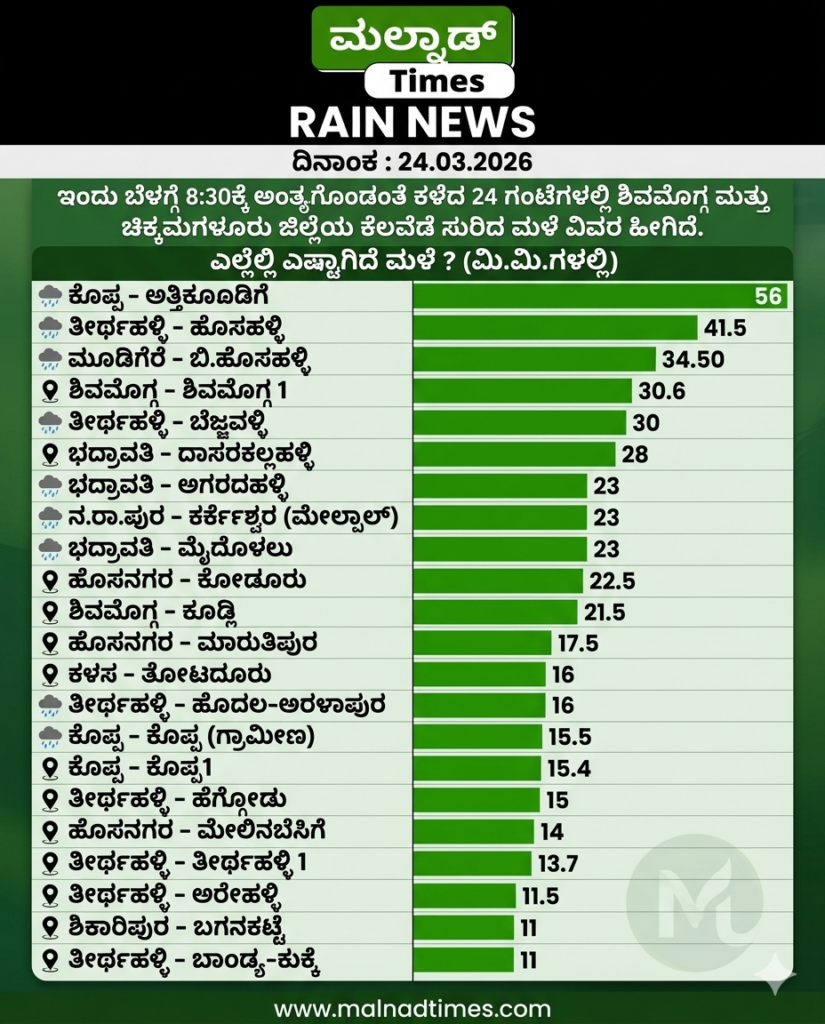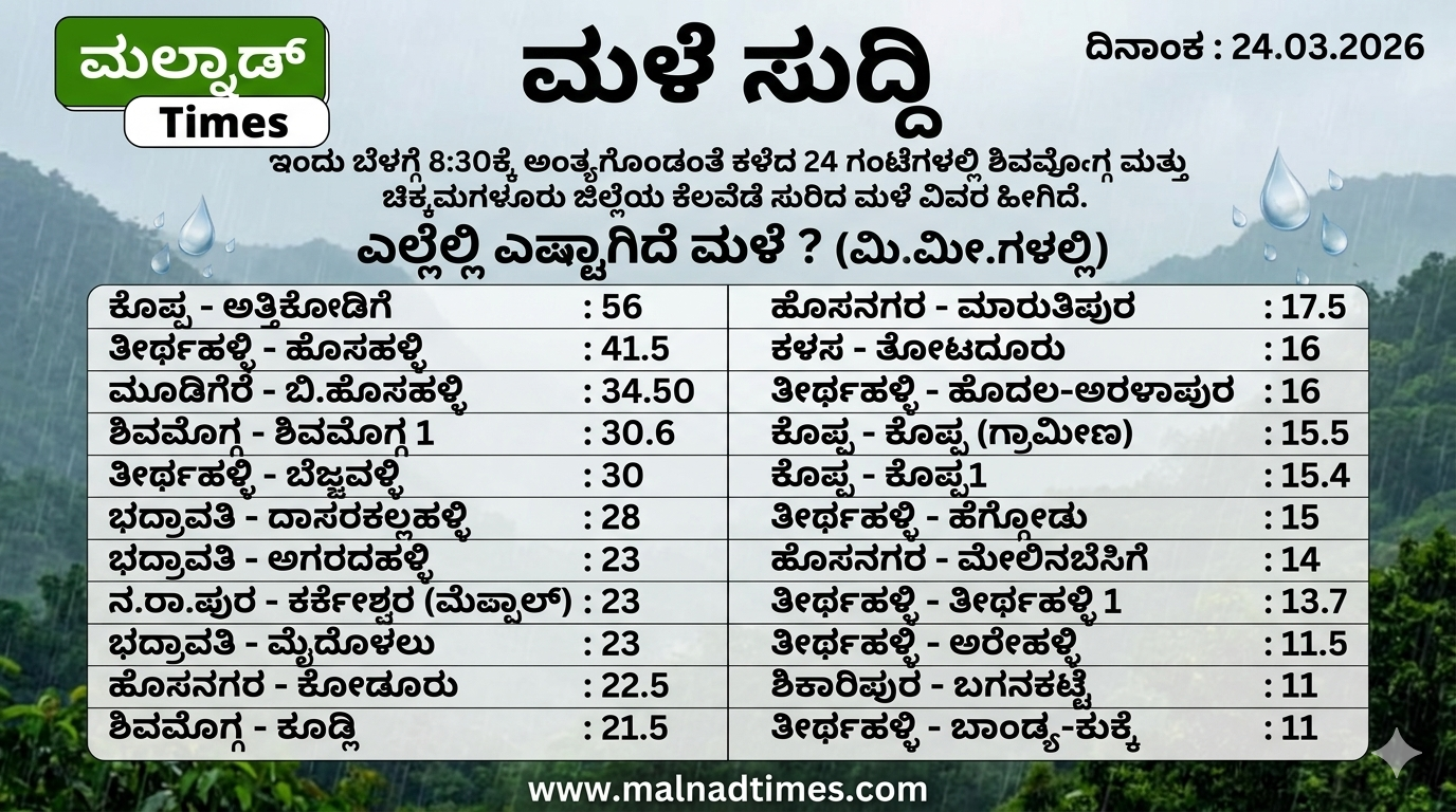 ಇಂದು ಬೆಳಗ್ಗೆ 8:30ಕ್ಕೆ ಅಂತ್ಯಗೊಂಡಂತೆ ಕಳೆದ 24 ಗಂಟೆಗಳಲ್ಲಿ ಶಿವಮೊಗ್ಗ ಮತ್ತು ಚಿಕ್ಕಮಗಳೂರು ಜಿಲ್ಲೆಯ ಕೆಲವೆಡೆ ಸುರಿದ ಮಳೆ ವಿವರ ಹೀಗಿದೆ.
