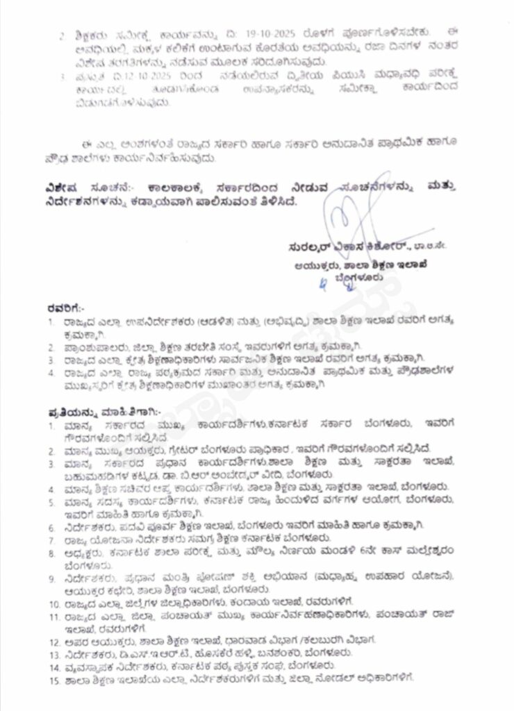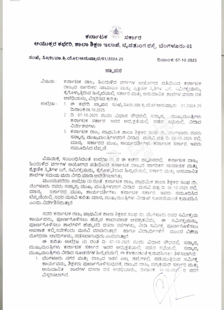 ರಾಜ್ಯದಲ್ಲಿ ನಡೆಯುತ್ತಿರುವ ಸಾಮಾಜಿಕ, ಆರ್ಥಿಕ, ಶೈಕ್ಷಣಿಕ ಸಮೀಕ್ಷೆಗೆ ಶಿಕ್ಷಕರನ್ನು ಪೂರ್ಣ ಪ್ರಮಾಣದಲ್ಲಿ ಬಳಸಿಕೊಳ್ಳಲು ಶಾಲೆಗಳ ದಸರಾ ರಜೆಯನ್ನು ಆಕ್ಟೋಬರ್ 18ರವರೆಗೆ ವಿಸ್ತರಿಸಲಾಗಿದೆ. ರಾಜ್ಯ ಸರ್ಕಾರಿ ನೌಕರರ ಸಂಘ ಕೂಡ ಈ ಬಗ್ಗೆ ರಾಜ್ಯ ಸರ್ಕಾರಕ್ಕೆ ಮನವಿ ಮಾಡಿತ್ತು.