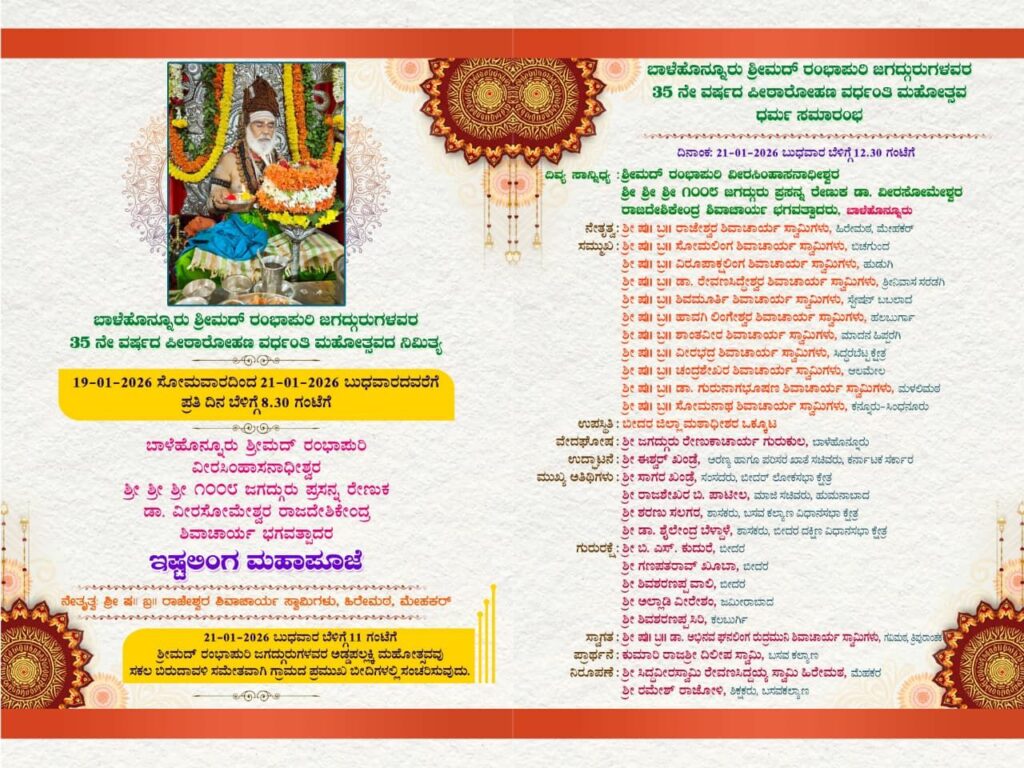 ಬಾಳೆಹೊನ್ನೂರು ; ಬಾಳೆಹೊನ್ನೂರು ಶ್ರೀಮದ್ ರಂಭಾಪುರಿ ಜಗದ್ಗುರು ಪ್ರಸನ್ನ ರೇಣುಕ ಡಾ.ವೀರಸೋಮೇಶ್ವರ ರಾಜದೇಶಿಕೇಂದ್ರ ಶಿವಾಚಾರ್ಯ ಭಗವತ್ಪಾದರ 35ನೇ ವರ್ಷದ ಪೀಠಾರೋಹಣ ವರ್ಧಂತಿ ಮಹೋತ್ಸವ ಧರ್ಮ ಸಮಾರಂಭ ಬೀದರ ಜಿಲ್ಲೆ ಭಾಲ್ಕಿ ತಾಲೂಕ ಮೇಹಕರ ಹಿರೇಮಠದಲ್ಲಿ ಜನವರಿ 21ರ ಬುಧವಾರ ಬೆಳಿಗ್ಗೆ 12.30 ಗಂಟೆಗೆ ಜರುಗುವುದೆಂದು ಶ್ರೀ ಜಗದ್ಗುರು ರಂಭಾಪುರಿ ಪೀಠದ ಪ್ರಕಟಣೆಯಲ್ಲಿ ತಿಳಿಸಿದೆ.