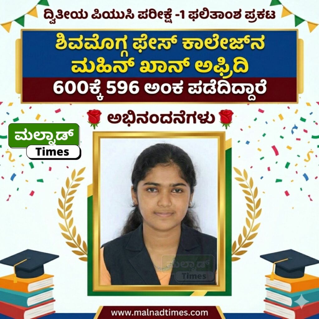 ಶಿವಮೊಗ್ಗ ; ಇಂದು ಮಧ್ಯಾಹ್ನ ದ್ವಿತೀಯ ಪಿಯುಸಿ ಪರೀಕ್ಷೆ-1 ಫಲಿತಾಂಶ ಪ್ರಕಟವಾಗಿದ್ದು ಶಿವಮೊಗ್ಗ ತಾಲ್ಲೂಕಿನ ಆಯನೂರು ಗ್ರಾಮದ ವಿದ್ಯಾರ್ಥಿನಿ ಮಹಿನ್ ಖಾನಮ್ ಅಫ್ರಿದಿ ಅವರು 600ಕ್ಕೆ 596 ಅಂಕಗಳನ್ನು ಪಡೆದು ಜಿಲ್ಲೆಗೆ ಪ್ರಥಮ ರ್ಯಾಂಕ್ ಗಳಿಸಿ ಹಾಗೂ ರಾಜ್ಯಕ್ಕೆ 3ನೇ ಟಾಪರ್ ಆಗಿ ಹೆಮ್ಮೆಯ ಸಾಧನೆ ಮಾಡಿದ್ದಾರೆ.