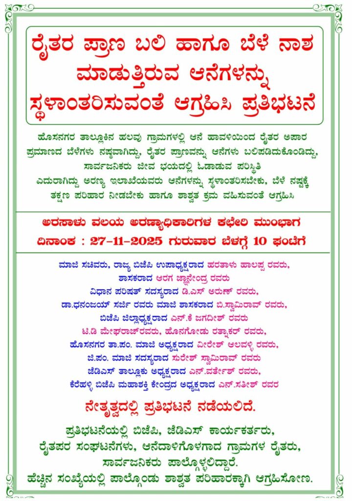 ಕಳೆದ ಐದಾರು ದಿನಗಳಿಂದ ಬೆಳ್ಳೂರು, ಅರಸಾಳು, ಹೆದ್ದಾರಿಪುರ ಗ್ರಾಮ ಪಂಚಾಯಿತ್ ವ್ಯಾಪ್ತಿಯಲ್ಲಿ ಬೀಡು ಬಿಟ್ಟಿರುವ ಆನೆಗಳನ್ನು ಅರಣ್ಯ ಇಲಾಖೆಯವರು ಸ್ಥಳಾಂತರ ಮಾಡುವುದು ಇಲ್ಲವೇ ಓಡಿಸುವ ಕೆಲಸವನ್ನು ಮಾಡುವಂತೆ ಹೇಳಿ ಕಳೆದ ವರ್ಷ ಸಹ ಇದೇ ರೀತಿ ಆನೆ ದಾಳಿ ನಡೆದಿದ್ದು ಆಗ ಜಿಲ್ಲಾ ಮುಖ್ಯ ಅರಣ್ಯ ಸಂರಕ್ಷಣಾಧಿಕಾರಿಗಳ ಕಚೇರಿ ಮುಂದೆ ಪ್ರತಿಭಟನೆ ನಡೆಸಲಾಗಿತ್ತು. ಅಧಿಕಾರಿಗಳ ಭರವಸೆಯಿಂದಾಗಿ ನಮ್ಮ ರೈತರು ಶಾಶ್ವತ ಪರಿಹಾರ ದೊರಕಿತು ಎಂದು ನಿಟ್ಟುಸಿರು ಬಿಡುವ ಮುನ್ನವೇ ಪುನಃ ಆನೆಗಳು ಒಕ್ಕರಿಸಿಕೊಂಡಿರುವುದು ರೈತರ ಆಕ್ರೋಶಕ್ಕೆ ಕಾರಣವಾಗಿದೆ.