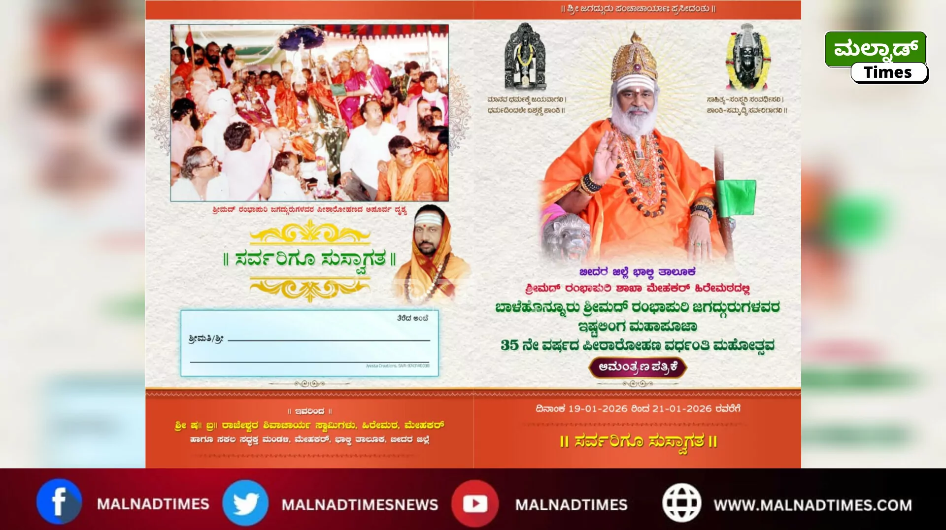 ಜ. 21ರಂದು ಮೇಹಕರ ಹಿರೇಮಠದಲ್ಲಿ ಶ್ರೀ ರಂಭಾಪುರಿ ಜಗದ್ಗುರುಗಳ 35ನೇ ವರ್ಷದ ಪೀಠಾರೋಹಣ ವರ್ಧಂತಿ