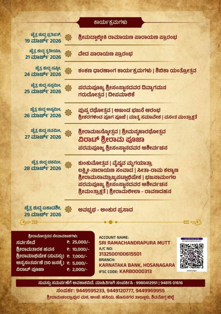 - ಮಾ. 28 ರಂದು ಕುಂಕುಮೋತ್ಸವ, ವೈಷ್ಣವ ಮೃಗಯಾತ್ರಾ, ಲಕ್ಷ್ಮಿನಾರಾಯಣ ಸಂವಾದ, ಸೀತಾ ರಾಮ ಕಲ್ಯಾಣ, ಶ್ರೀರಾಮ ಸಾಮ್ರಾಜ್ಯ ಪಟ್ಟಾಭಿಷೇಕ, ಅಖಂಡ ಭಜನಾ ಮಂಗಲ, ಶ್ರೀಗಳವರಿಂದ ಆಶೀರ್ವಚನ, ಶ್ರೀ ಮಂತ್ರಾಕ್ಷತೆ ಹಾಗೂ ಸಂಜೆ ಶ್ರೀರಾಮಲೀಲಾ, ರಾವಣದಹನ ಕಾರ್ಯಕ್ರಮ.