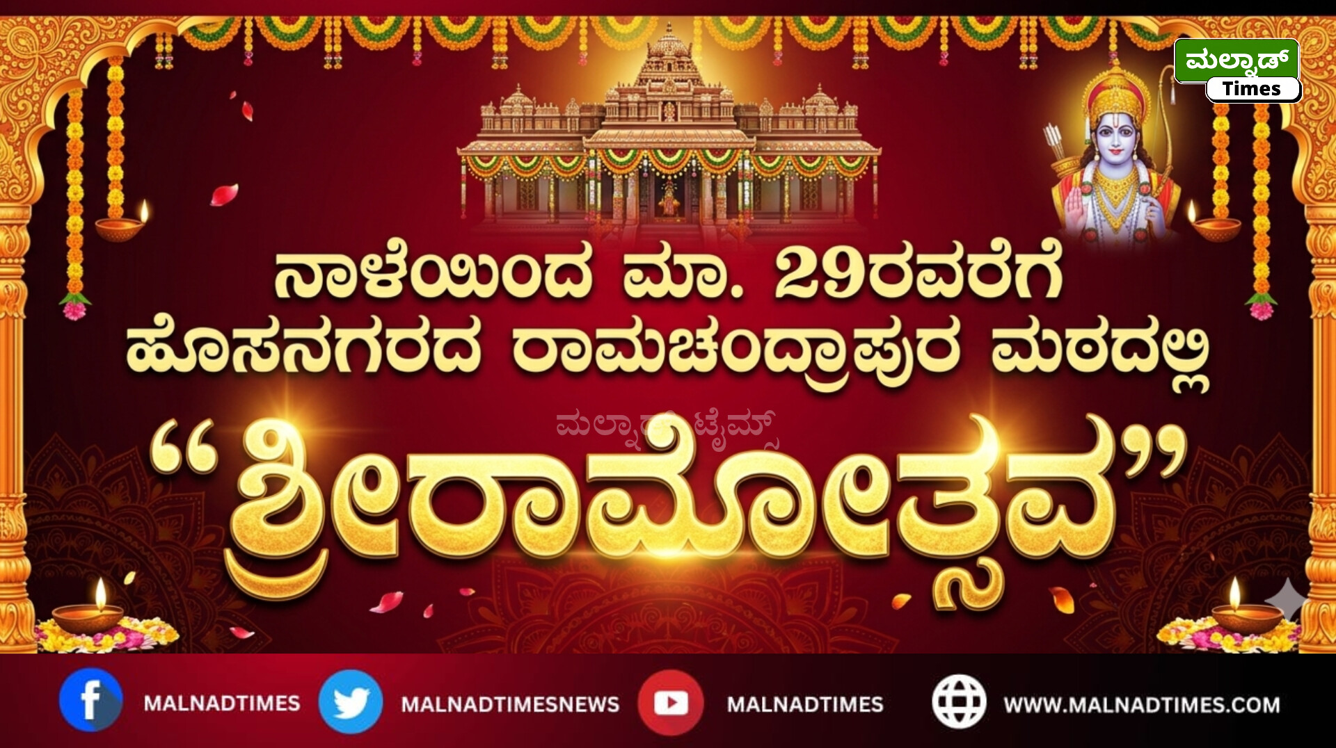 - ಮಾ. 27 ರಂದು ಶ್ರೀರಾಮಜನ್ಮೋತ್ಸವ, ಶ್ರೀಮನ್ಮಹಾರಥೋತ್ಸವ, ವಿರಾಟ್ ಶ್ರೀರಾಮಪೂಜೆ ಹಾಗೂ ಆಶೀರ್ವಚನ.
